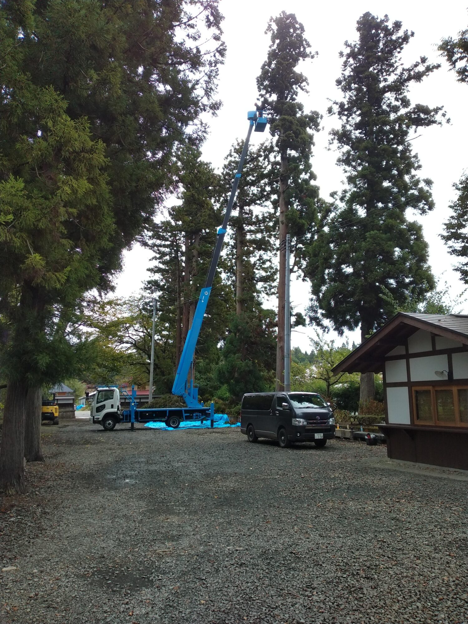 午前中に山門に向かって左側三本の杉の木伐採作業が終了。