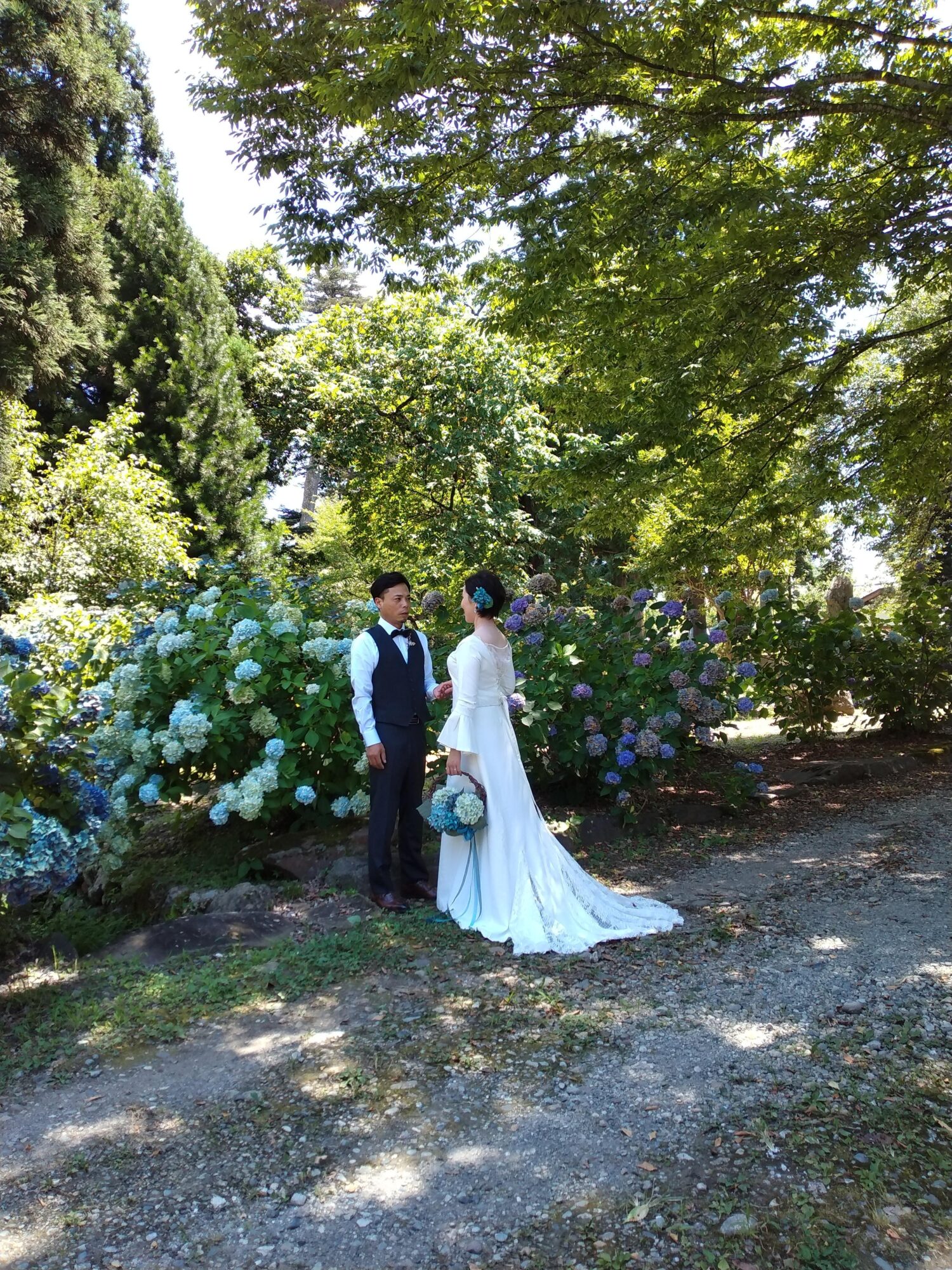 強すぎない木漏れ日の中、時折吹く風がブーケに添えられたリボンをなびかせて、それはそれは素敵なシチュエーション。