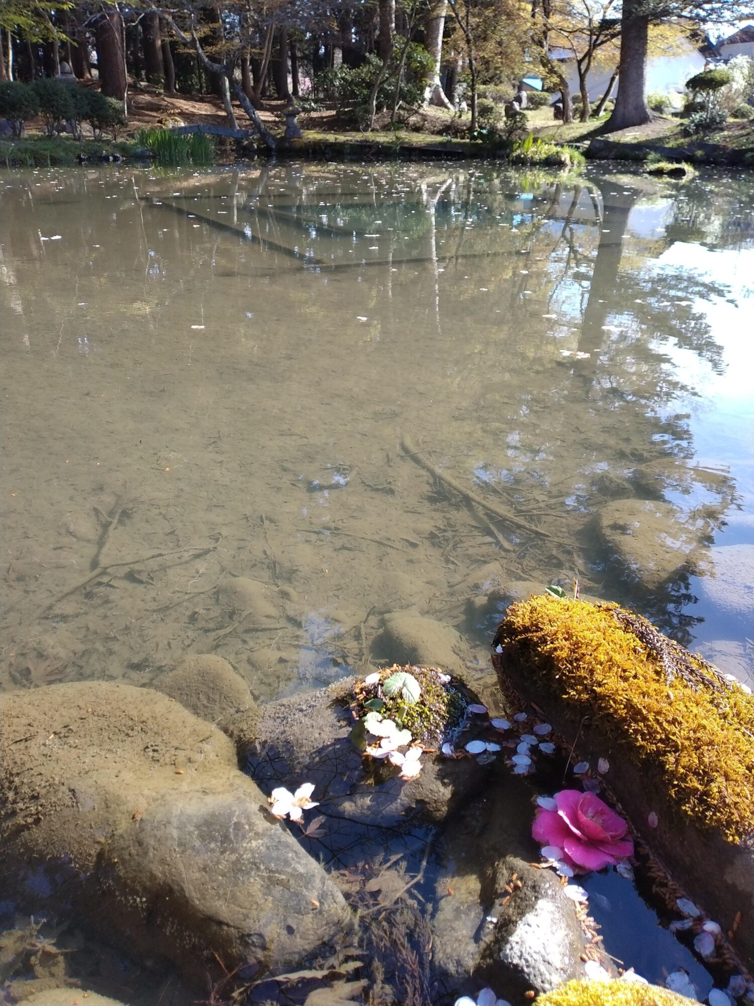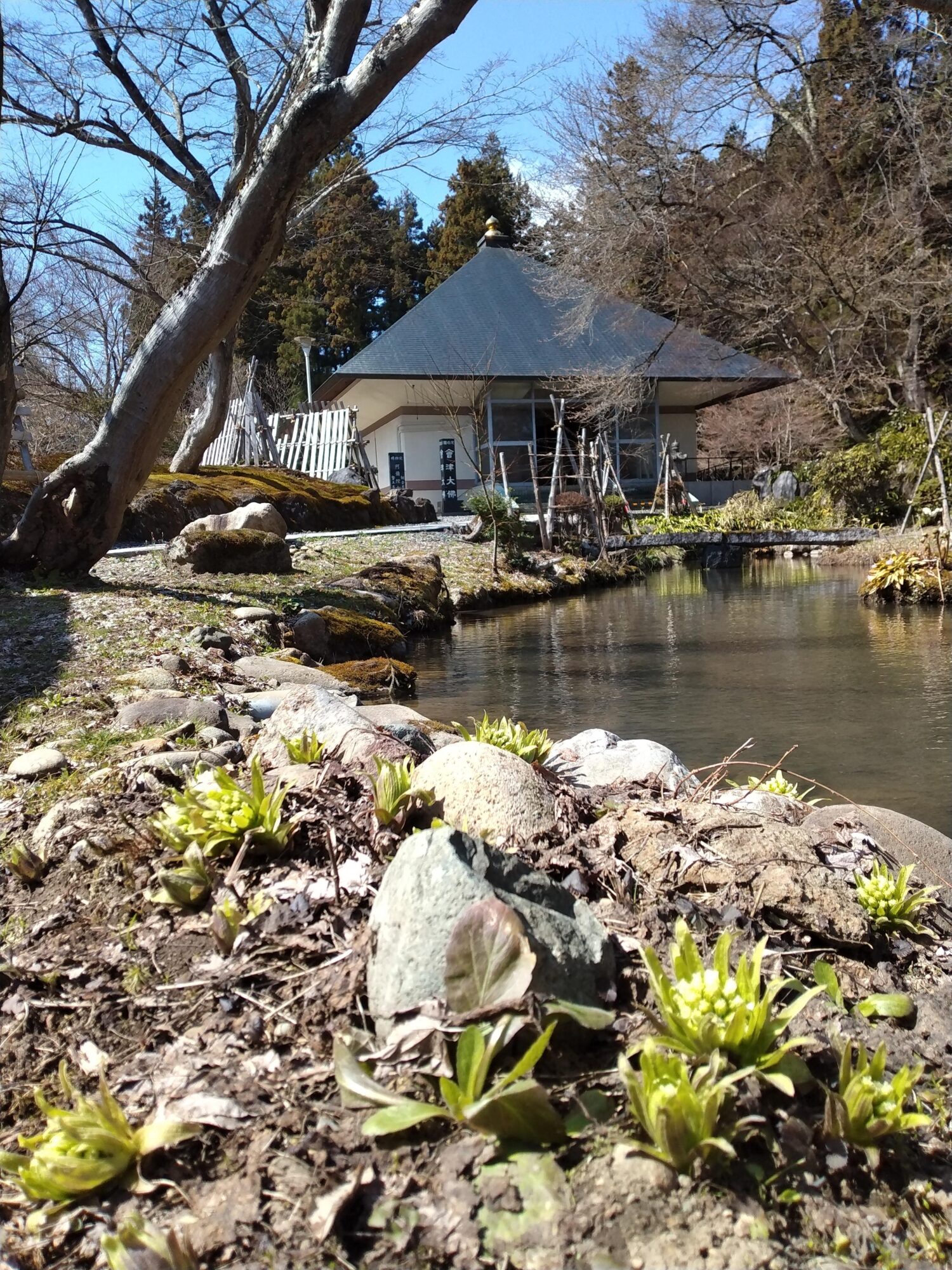 去年、お檀家さんが池の周りのあちこちに植えて下さった福寿草。