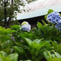 心字池の右端に、毎年秋にも花を咲かせるれんげつつじ、その少し左手に紫陽花がぽんぽんぽーんと手毬のように咲いています。